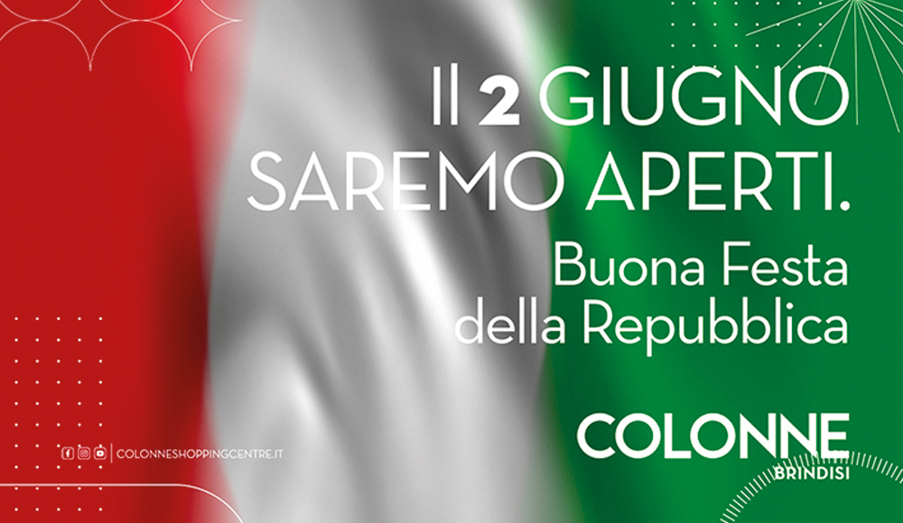 2 giugno Buona Festa della Repubblica da #colonneshoppingcentre!Il 2 giugno saremo aperti con i seguenti orari: Negozi e Ipermercato 🕛 dalle 10:00 alle 21:00Area Food 🕛 dalle 10:00 alle 22:00 Vi aspettiamo!