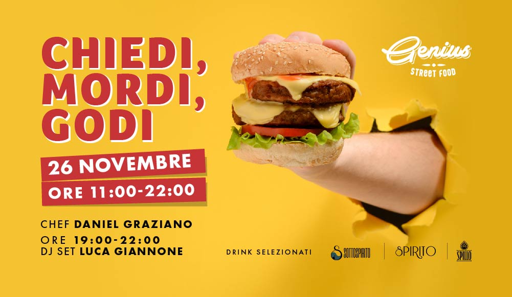 Chiedi, mordi, godi ℂℍ𝕀𝔼𝔻𝕀, 𝕄𝕆ℝ𝔻𝕀, 𝔾𝕆𝔻𝕀 🍔 Venerdì 26 novembre in collaborazione con GENIUS Street Food vi aspettiamo dalle 11:00 alle 22:00. Sarà presente anche lo Chef Daniel Graziano e dalle 19:00 DJ Set con Luca Giannone.