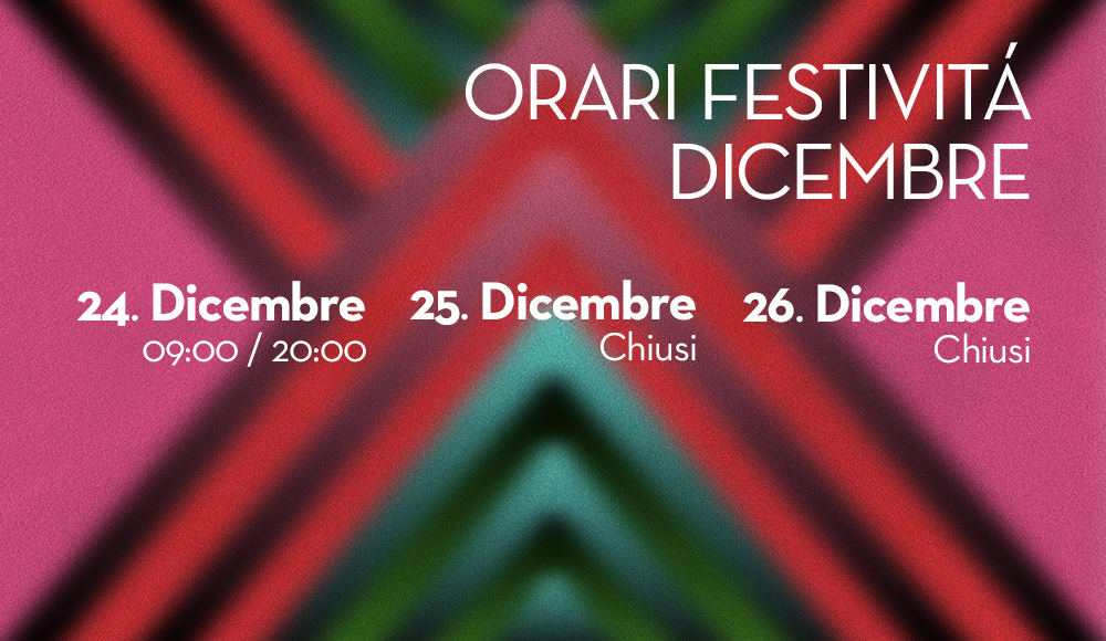 ORARI FESTIVITÀ DICEMBRE 𝗢𝗥𝗔𝗥𝗜 𝗗𝗜𝗖𝗘𝗠𝗕𝗥𝗘: 24 Dicembre – 9.00 / 20.0025 Dicembre – Chiusi26 Dicembre – Chiusi